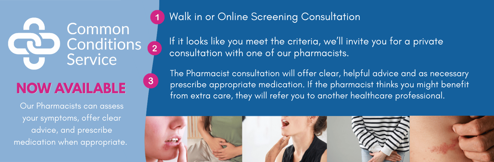 You are welcome to call in to the pharmacy directly and you will be guided through a short condition specific preliminary screening form to assist the pharmacist to see if you meet the HSE Common Conditions Service criteria. You should come to the pharmacy at least 30 minutes before closing time. The pharmacist will see you at the earliest opportunity once the screening process has been completed.